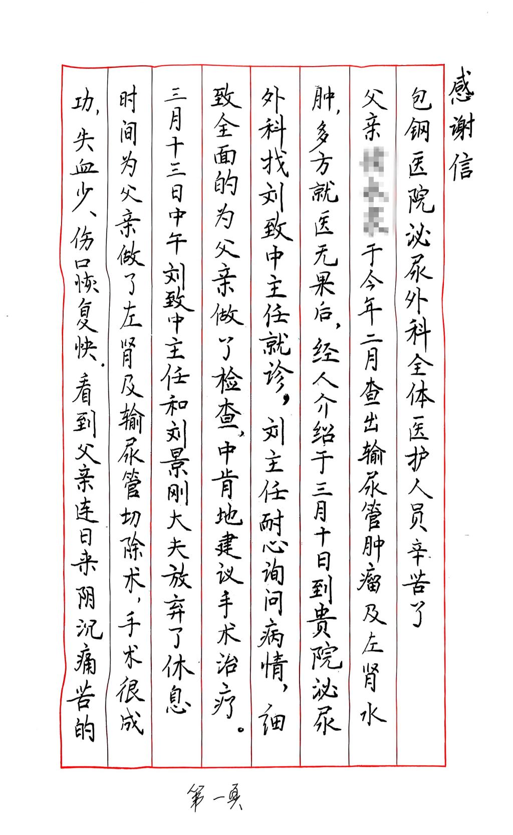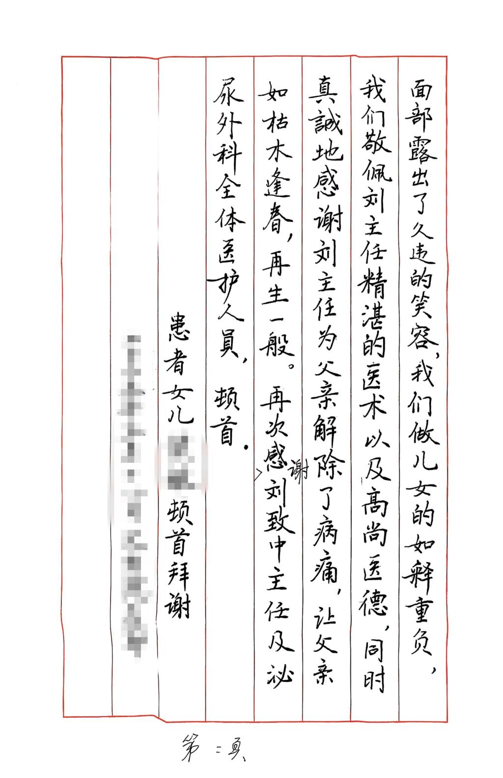 今年3月,张大爷查出输尿管肿瘤及左肾水肿,多方就医无果后来院就诊。刘致中主任耐心解答疑问,询问病情,为张大爷制定了详细的治疗方案。刘致中主任和刘景刚医生放弃午休为张大爷手术,经过精心治疗和悉心护理,张大爷顺利出院。出院时,张大爷的女儿特意手写了这封感谢信,以此表达对泌尿肾脏医学部医护人员工作的肯定与感激。