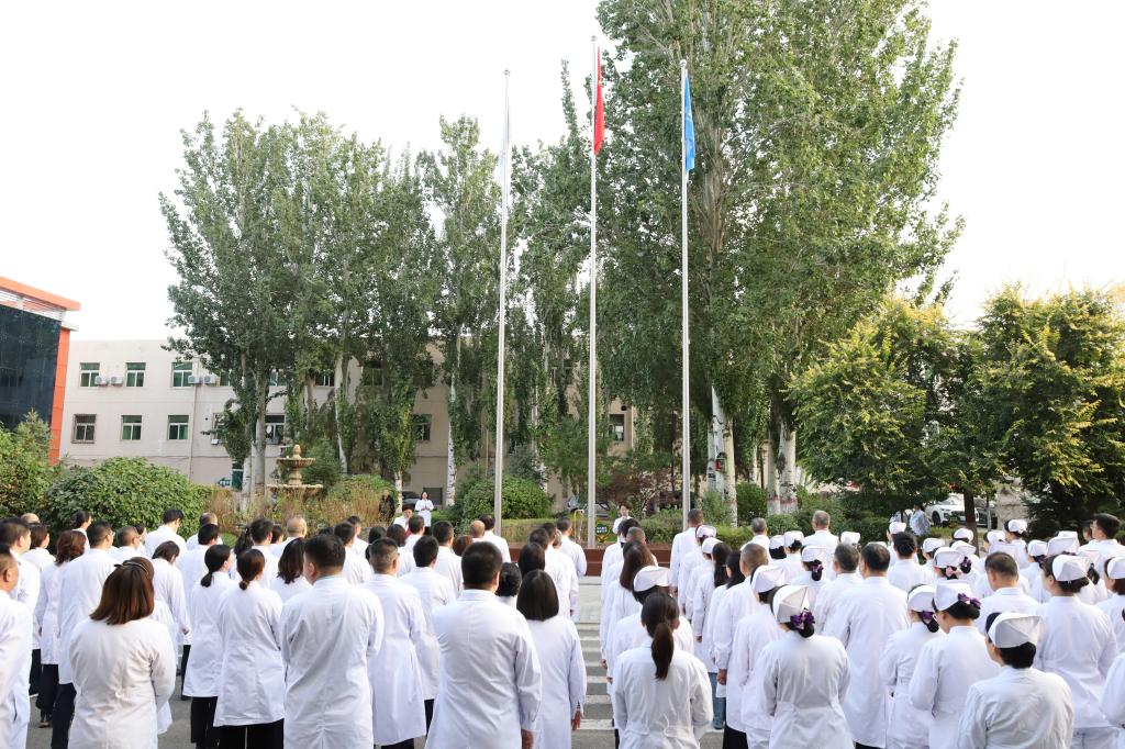 医院党委书记傅冠峰及在院领导班子成员、各科室正副职及党支部书记、护士长、医生代表、护士代表、新员工代表、学生代表、后勤代表等共200余人参加仪式。医院院长、党委副书记张凤珍主持升旗仪式。