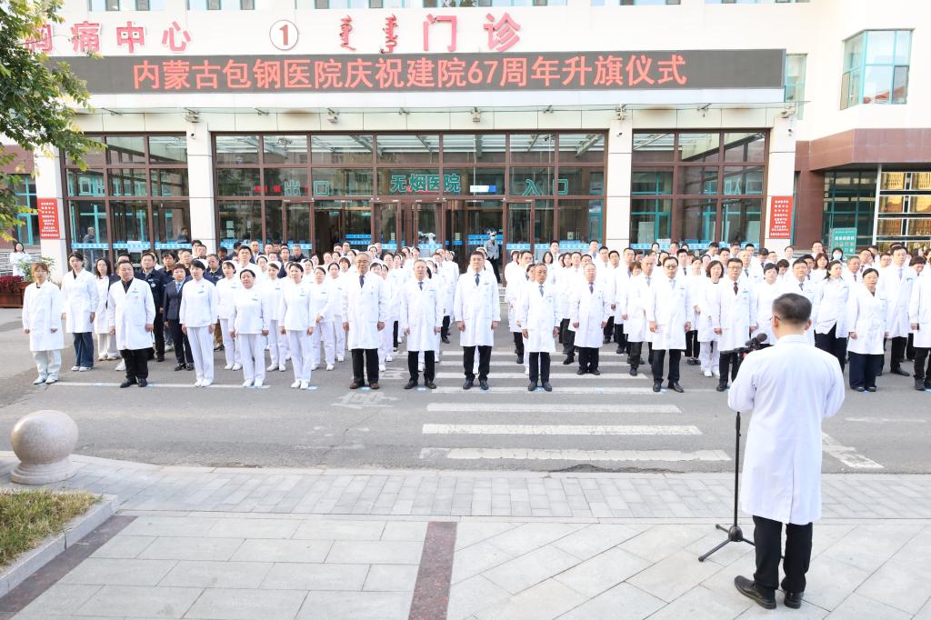 七十六载波澜壮阔,六十七年砥砺奋进。为庆祝中华人民共和国成立76周年,喜迎医院建院67周年,9月30日清晨,内蒙古包钢医院在门诊楼前举行“国庆日、院庆日”升旗仪式,以昂扬的姿态致敬伟大祖国,凝聚奋进力量。