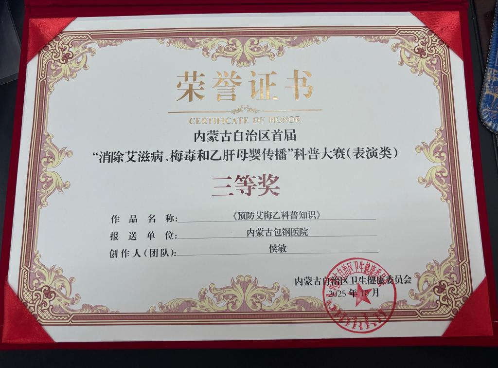近日,由内蒙古自治区卫生健康委员会主办的内蒙古自治区首届“消除艾滋病、梅毒和乙肝母婴传播”科普大赛结果揭晓,内蒙古包钢医院选送的科普视频《预防艾梅乙科普知识》从全区133件参赛作品中脱颖而出,荣获表演类三等奖。
