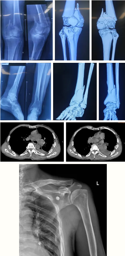 一场突如其来的车祸,让70岁的王大爷(化名)瞬间陷入绝境:右股骨髁上粉碎性骨折;左胫骨中下段及远端粉碎性骨折;左外踝骨折;右髌骨骨折;左锁骨远端骨折; 胸7、9、12椎体压缩性骨折; 腰4、5椎体压缩性骨折;8左侧多发肋骨骨折等多处骨折,生命体征在剧痛与失血中急速流逝。
