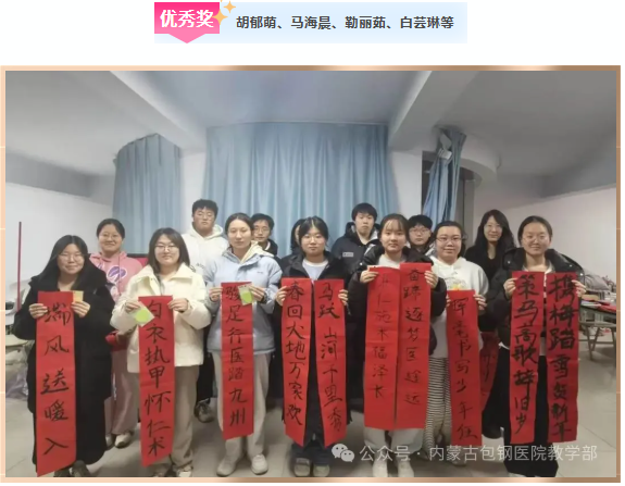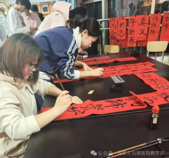 为承千年文脉,扬时代新风,营造喜庆祥和的新春文化氛围,内蒙古医科大学第三临床医学院(内蒙古包钢医院)“墨韵迎春”迎新年春联创作书法大赛于2026年1月11日晚在内蒙古医科大学金山校区7号楼公寓楼活动室圆满落幕。活动以笔墨寄情,以红纸传福,将医学人文与传统文化交融共鸣,吸引了全院师生热情参与,展现青春风华。