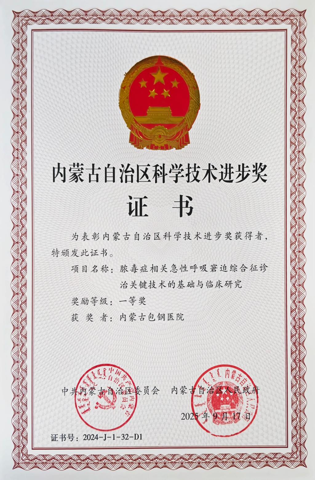 呼吸与危重症医学科团队完成的《脓毒症相关急性呼吸窘迫综合征诊治关键技术的基础与临床研究》科技成果荣获内蒙古自治区科技进步一等奖。医院获批自治区自然科学基金项目10项,其中青年基金项目4项,面上项目4项,一般联合基金项目2项。