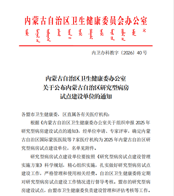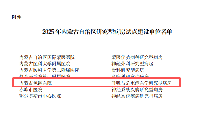 近日,自治区卫健委发布了《内蒙古自治区卫生健康委办公室关于公布内蒙古自治区研究型病房试点建设单位的通知》(〔2026〕40号)文件,内蒙古包钢医院获批成为2025年自治区研究型病房试点建设单位之一,建设试点为呼吸与危重症医学研究型病房。