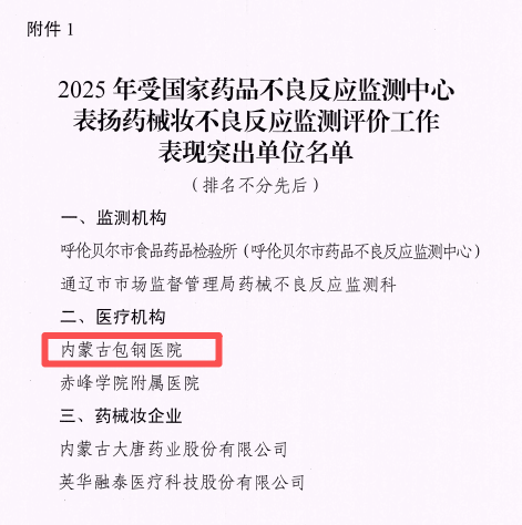 近日,国家药品不良反应监测中心、内蒙古自治区药品审评和药物警戒中心分别印发关于表扬2025年全国、全区药械妆不良反应监测评价工作表现突出单位的通报文件,内蒙古包钢医院凭借药品、医疗器械、化妆品不良反应监测评价工作中突出表现,荣获国家、自治区两级通报表扬。这不仅是国家及自治区对医院医疗安全管理工作的权威认可,更是对全院上下坚守患者安全底线的有利褒奖。