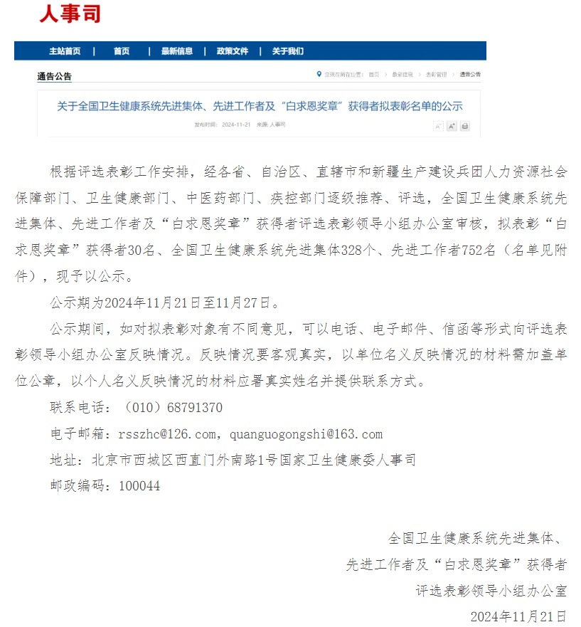11月21日,全国卫生健康系统先进集体、先进工作者及“白求恩奖章”获得者拟表彰名单开始公示。内蒙古包钢医院呼吸与危重症医学科主任杨敬平拟入选全国卫生健康系统先进工作者。