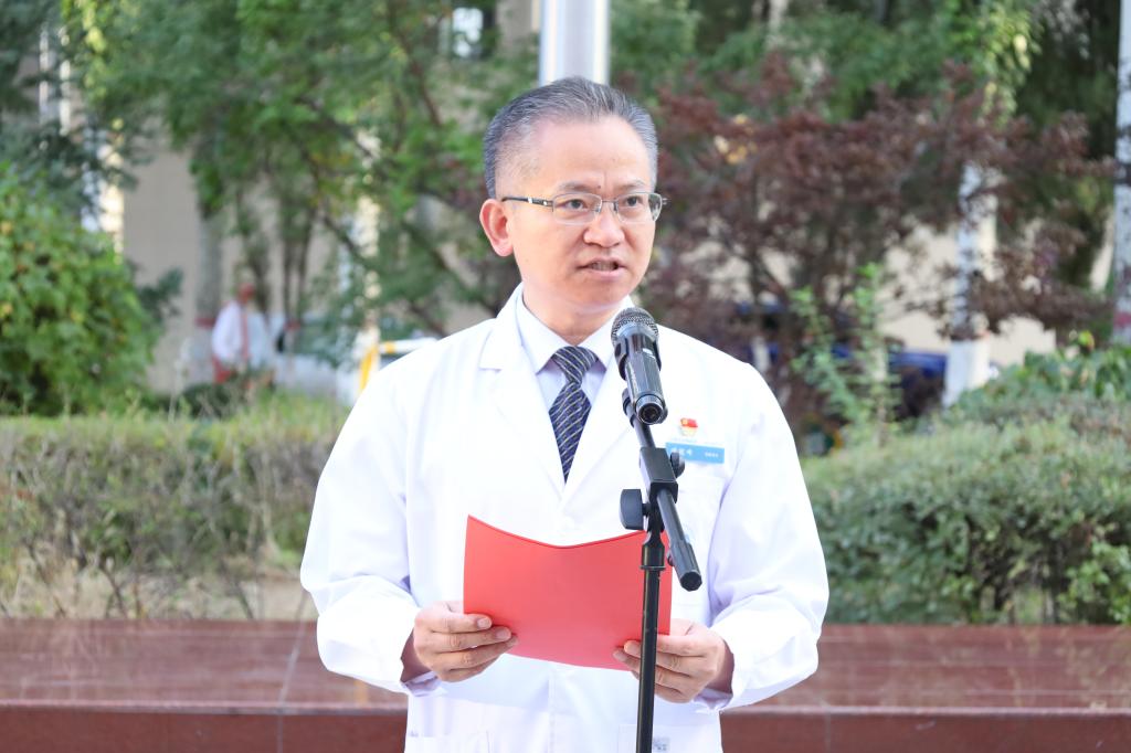 医院党委书记傅冠峰及在院领导班子成员、各科室正副职及党支部书记、护士长、医生代表、护士代表、新员工代表、学生代表、后勤代表等共200余人参加仪式。医院院长、党委副书记张凤珍主持升旗仪式。