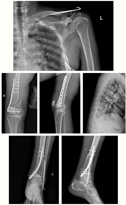 一场突如其来的车祸,让70岁的王大爷(化名)瞬间陷入绝境:右股骨髁上粉碎性骨折;左胫骨中下段及远端粉碎性骨折;左外踝骨折;右髌骨骨折;左锁骨远端骨折; 胸7、9、12椎体压缩性骨折; 腰4、5椎体压缩性骨折;8左侧多发肋骨骨折等多处骨折,生命体征在剧痛与失血中急速流逝。