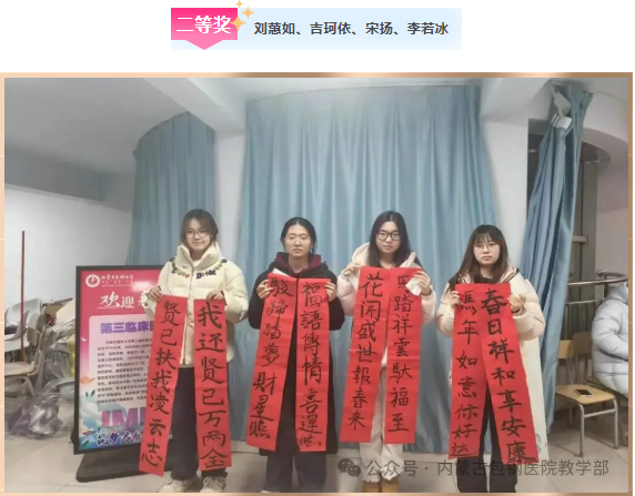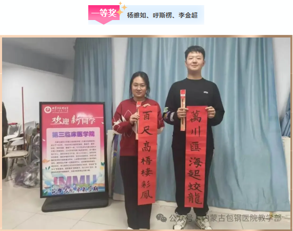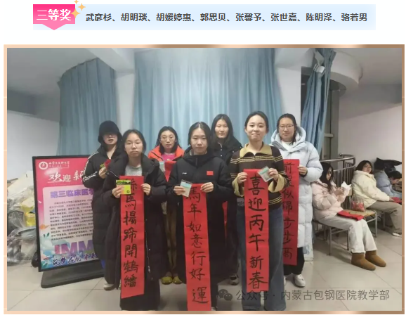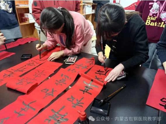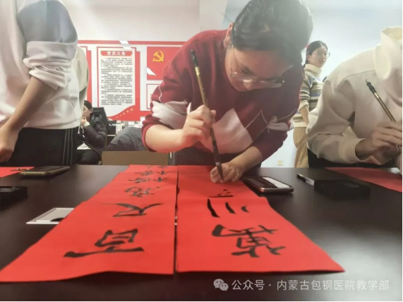 为承千年文脉,扬时代新风,营造喜庆祥和的新春文化氛围,内蒙古医科大学第三临床医学院(内蒙古包钢医院)“墨韵迎春”迎新年春联创作书法大赛于2026年1月11日晚在内蒙古医科大学金山校区7号楼公寓楼活动室圆满落幕。活动以笔墨寄情,以红纸传福,将医学人文与传统文化交融共鸣,吸引了全院师生热情参与,展现青春风华。