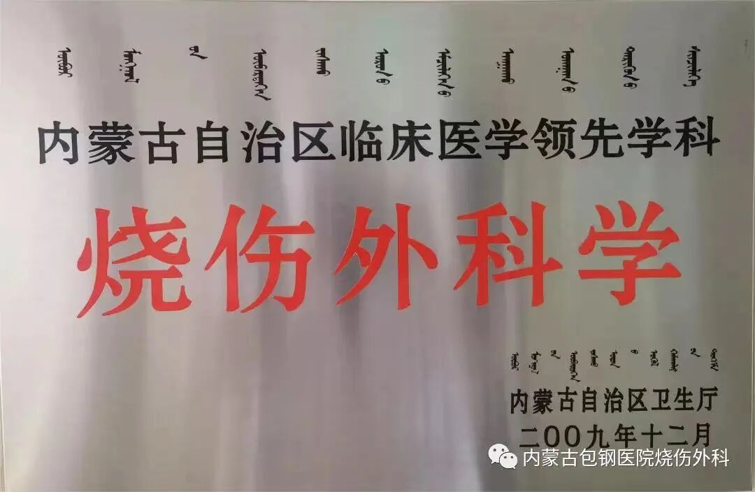 内蒙古包钢医院烧伤外科始建于包钢建成之初的1958年,当时成立了烧伤救治组,是我国最早开展烧伤治疗的科室之一。随着治疗水平的提高,1992年,由烧伤救治组独立成烧伤外科。1993年建立内蒙古自治区唯一的皮肤软组织储存库;1995年建立烧伤实验室;2000年被评为首批包头市医学专业领先学科;2001年成为包头市烧伤整形外科分会主任委员单位和2005年成为内蒙古烧伤整形专科分会主任委员单位;内蒙古自治区唯一的烧伤整形专业研究生培养基地,逐步壮大发展成内蒙古自治区最大的烧伤整形专业科室;2005年成立内蒙古烧伤医学研究所;2009年被评为内蒙古自治区领先学科,同年被卫生厅评为内蒙古自治区烧伤外科专业质控中心。