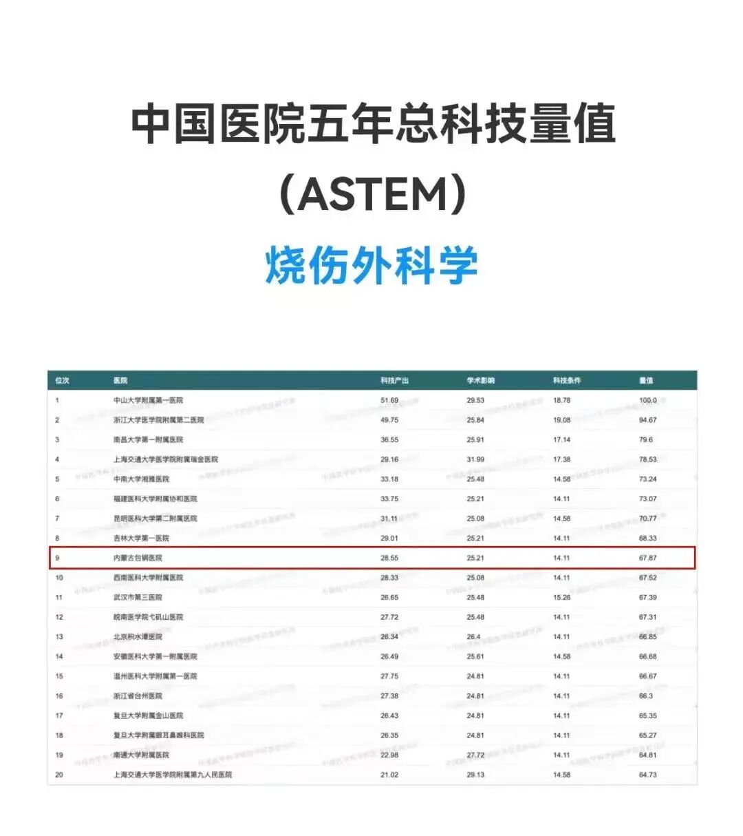 分别于2014、2015、2016、2017年入围华北地区医院专科声誉排行榜前五强,是内蒙古唯一入围的专科;在中国医学科学院、中国医学科学院医学信息研究所发布的中国医院科技量值(STEM)年度排名中,全国烧伤外科学领域,内蒙古包钢医院烧伤外科位列全国烧伤专科榜2016年度23名,2017年度22名,2018年度24名,2019年度10名,2020年度9名,2021年中国医院五年总科技量值(ASTEM)排名第9名,2022年度中国医院科技量值(STEM)排名第11名,内蒙古地区专科第一名。2018年成为中国创面修复联盟建设培育单位,该单位在中国医师协会有备案,属于由国务院批准的《中国创面修复科建设“1239”三年行动计划》中医疗机构认证的关节一环。2019年创建包头市创面修复专科联盟、内蒙古包钢医院创面治疗中心。2022年成立创面修复科,隶属烧伤外科。