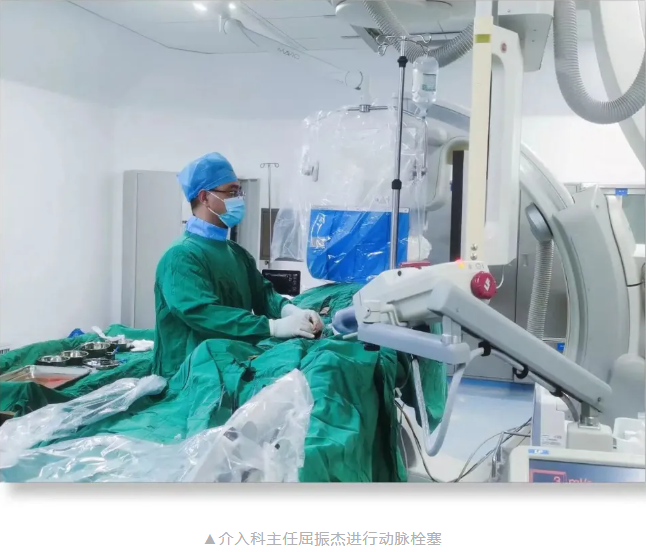 麻醉科团队迅速到位,麻醉师杨胜利快速建立深静脉穿刺通道、加压,维持患者生命体征;输血科启动紧急供血预案,共输红细胞2400ml、血浆1200ml,一条生命血液供应链高效运转;血压平稳后,介入科主任屈振杰随即接力,进行子宫动脉的精准栓塞……