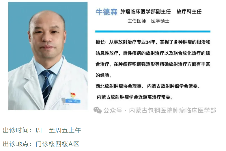 门诊地点:内蒙古包钢医院门诊楼4楼A区,肿瘤临床医学部1楼放疗科
