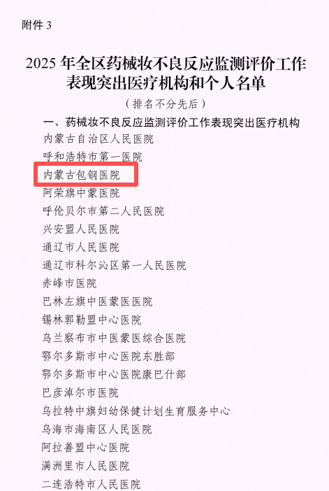 近日,国家药品不良反应监测中心、内蒙古自治区药品审评和药物警戒中心分别印发关于表扬2025年全国、全区药械妆不良反应监测评价工作表现突出单位的通报文件,内蒙古包钢医院凭借药品、医疗器械、化妆品不良反应监测评价工作中突出表现,荣获国家、自治区两级通报表扬。这不仅是国家及自治区对医院医疗安全管理工作的权威认可,更是对全院上下坚守患者安全底线的有利褒奖。
